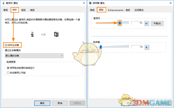 3)弹出 [麦克风属性] 窗口,在 “侦听” 菜单中勾选 “侦听此设备” 选项,并在 “级别” 菜单中麦克风音量设置为70%〜90%左右。如图