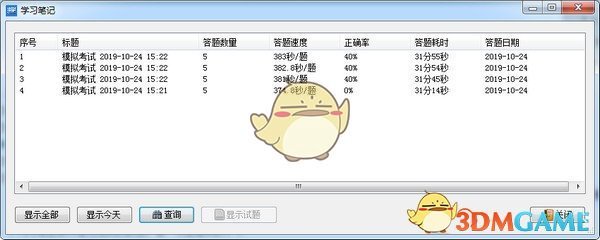 2. 学习笔记:记录学习过程,每次答题的结果都会展示在列表当中。