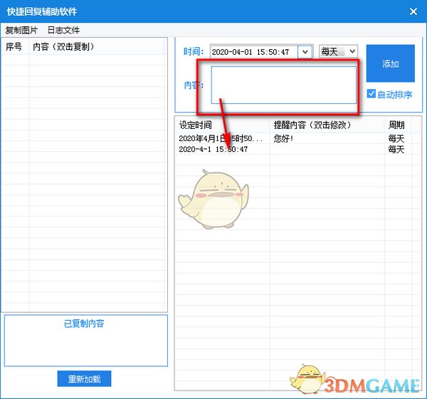 一、下载打开软件,在上方的内容处输入定时提醒的内容,设置好时间,点击添加,以后到了这个时间点,软件就会提醒用户做某些事,相当于一个闹钟。
