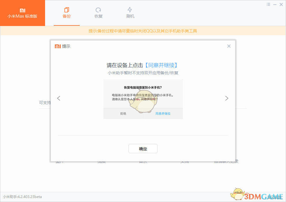 点击“新建备份”会提示等待手机授权,需要在手机上进行授权操作: