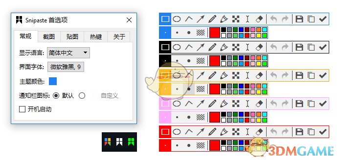 对大部分用户来说,第一次打开 Snipaste 后,将选项中的“开机启动”勾上,再根据自己的习惯调整一下全局热键,其他选项全使用默认设置即可。