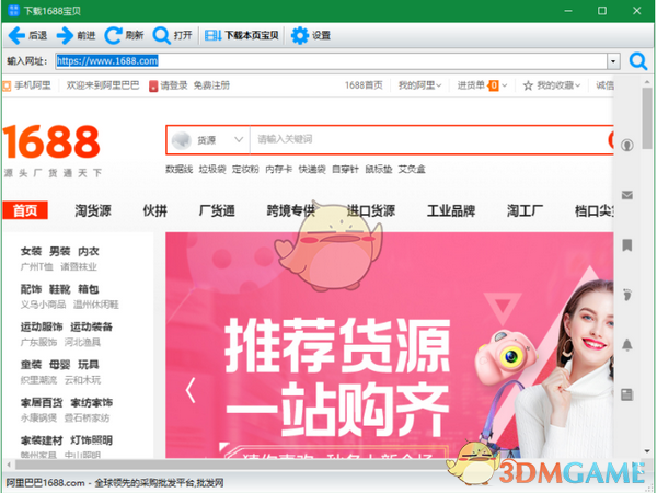 第一步:以1688为例,点击左上角“下载1688宝贝”按钮,弹出窗口中会自动打开1688的首页,如图所示: