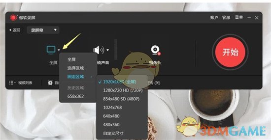 点击模式右侧的向下箭头后展开多种录屏模式。可选择全屏、区域以及自定义等多种录屏选项。