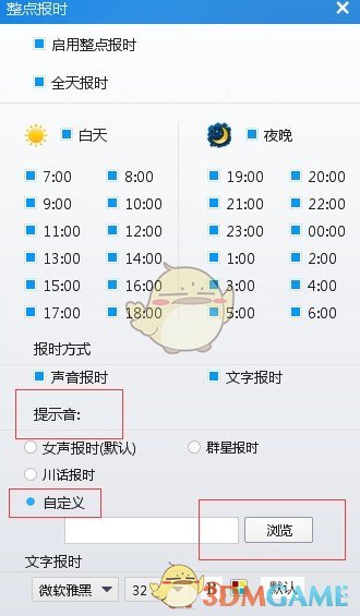 2、进入到整点报时界面后,我们可以看到有全天报时、报时方式、提示音、自定义等选项。我们选择自定义下的浏览选项,自己设置报时语音。
