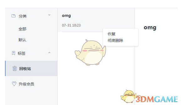 1、如果你在使用过程中出现之前编辑的文字不小心删除了,其实用户完全可以在回收站中进行恢复,在左边的栏目中点击“回收站”选项,选中想要恢复的章节,右键点击其中的“恢复”选项;当然你也可以选择彻底删除,不过删除之后将不可恢复,如下图所示: