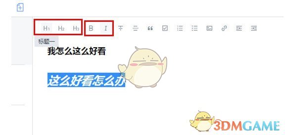 2、选中想要调节的文字,点击上方红框标注内开头的三个选项,这些选项就可以帮助用户调节字体大小,从左往右分别是标题一、标题二以及标题三,每个选项可以调节的字体大小都有所不用,除此之外右边这两个选项则可以调节字体的粗细与斜体,如下图所示: