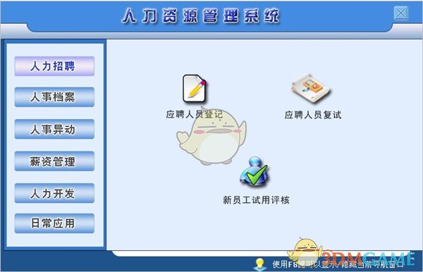1、人力招聘:应聘人员登记、应聘人员复试、新员工试用评核;