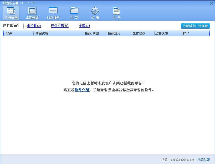 弹窗吸尘器是一款拦截弹窗的小工具,工具占用小效果好可以拦截各类弹窗,使您免除弹窗的骚扰,工具界面简洁明了,操作简单运行后即可,是一款值得下载的好软件,可以拦截目前互联网上安装最多的数十款软件的各类弹窗,使您免除弹窗的骚扰,感兴趣的朋友可以在本站下载体验。