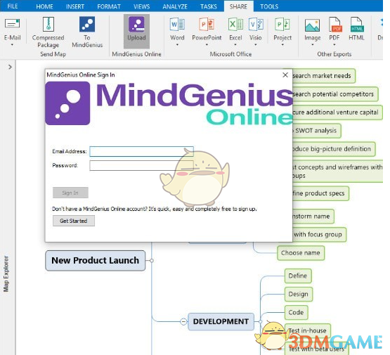 如果你有一个可能对其他MindGenius用户有用的地图,现在很容易分享它。在“共享”选项卡上,单击“致MindGenius”按钮。我们将在您的网站上将您的地图作为尴板提供。