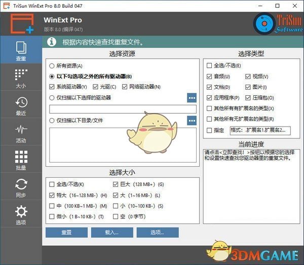 该工具的UI具有现代外观,干净直观。选项和功能在不同的选项卡中排列整齐。这些选项卡位于左侧,可以轻松访问重复项,大小,最近或 Windows 活动,批处理操作,同步模式以及程序设置。