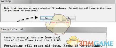 4、这时会连续弹出对话框,提示将进行格式化,都点击Yes或OK;