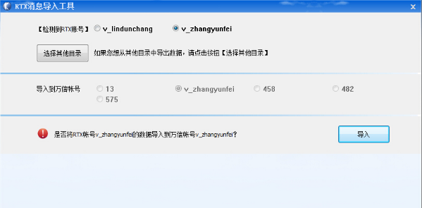请确保您已经使用您的国美小虫帐号在本机正确登录过国美小虫windows客户端;双击打开国美小虫程序目录下或桌面上的导出导入工具“RTX消息导入工具”,导出导入工具将自动查找在您本机上登录过的RTX帐号及国美小虫帐号,并做智能匹配;如果您在本机上登录过多个RTX帐号或国美小虫帐号则请您选择要导出的帐号及要导入的帐号,如果您想从备份的RTX历史数据中导出,请选择『选择备份目录』;