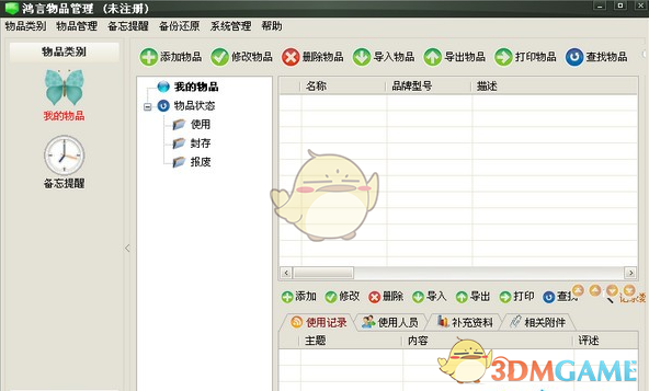 鸿言物品管理软件可以灵活设置物品类别、物品状态,记录物品的型号、来源、价格、存放位置、质保信息等等。可以对物品的使用信息、使用人员进行随时记录,可以添加补充资料、相关附件,以便扩充物品的相关信息。可以设置备忘提醒,安排日常事务。