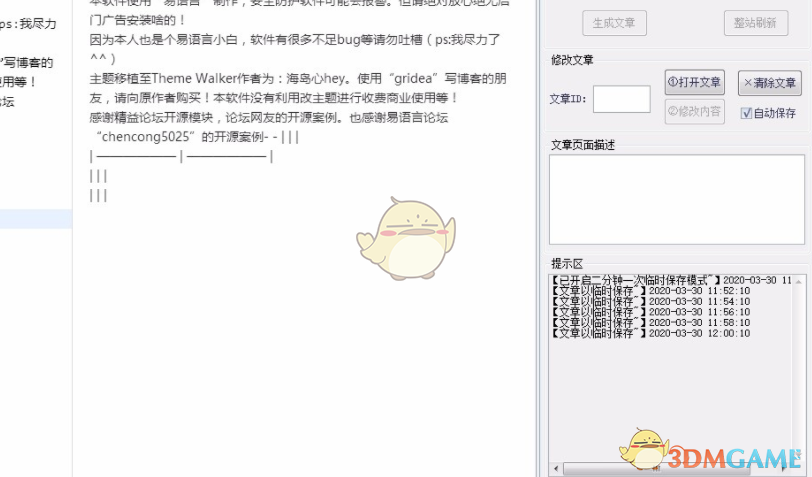Chronicle是使用易语言开发,搭配“Editor.md”编辑器。可以使用markdwon写文章,也支持html格式代码。它的特点是: