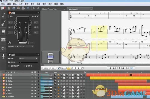 Guitar Pro提供了许多阅读特点:三种符号(标准/绘画/削减),变焦和虚拟指/键盘形象化的精确指法。