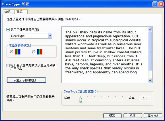 ClearType Tuning就是调整ClearType效果的工具,使用ClearType Tuning可以根据你的显示器将 ClearType调整至最佳效果。ClearType是一种 Windows 用来优化液晶显示器文字显示效果的技术,使用 ClearType技术可以让文字显示得平滑而美观。