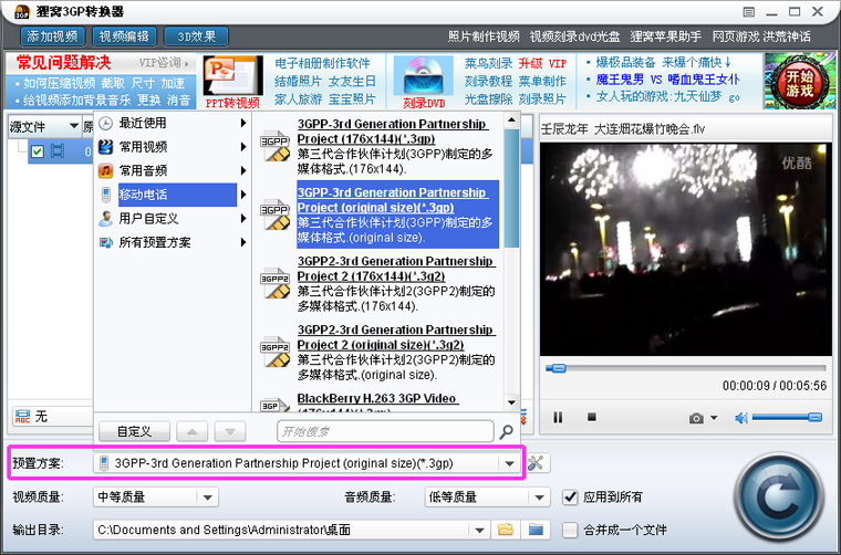 1、可根据您的手机,选择合适的3GP参数,如分辨率等。