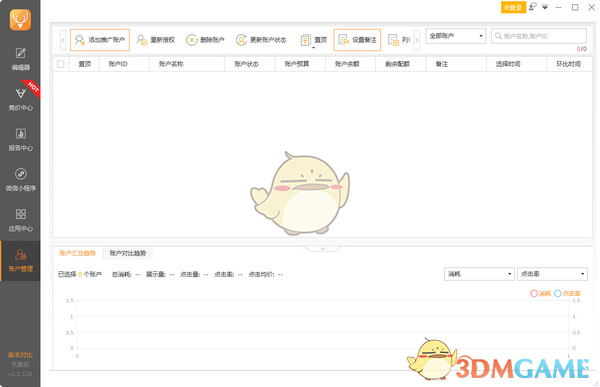 首次登陆小鹿卧龙助手会首先进入账户管理页面,成功添加绑定卧龙推广账户后才能使用小鹿卧龙助手提供的各项功能服务,在账户管理页面可以对推广账户进行添加、删除、刷新、重新登陆等操作。