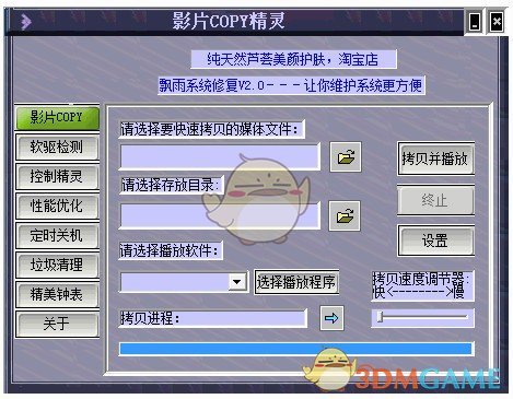 你是担心经常用CDROM或DVDROM看影片会缩短它们的寿命吗?但又不想等待把文件拷贝到硬盘的时间,那你就可以用软体小精灵一边看影片一边拷贝,而CDROM或DVDROM只要完成把文件拷贝到硬盘的任务就可以休息。这过程只需几分钟的时间,这就实现了保护功能。此外软件还提供软驱检测功能,你可以用来校准磁头和清洁磁头,还有定时关机功能、系统优化、清除硬盘垃圾文件功能、杀灭浏览器广告功能、程序管理功能、随意隐藏功能(你可以用它保护你的私隐)。
