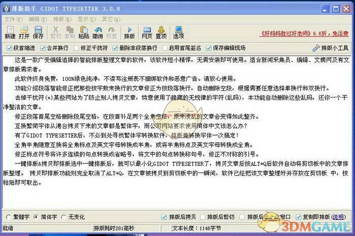 《排版助手(Gidot Typesetter)3.1.1》是一款智能排版整理文章的软件,这款软件适合编辑、文摘网及有文章排版需求者,软件内的功能非常丰富,操作也很简单,是一款非常不错的软件,感兴趣的小伙伴欢迎下载使用噢!