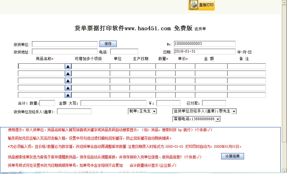 货单票据打印软件是一款快速生成货单、打印货单、批量打印、管理货单、客户管理、货品管理等为一体的销售软件,告别手写,全方位提高工作效率的从自动化开始入手。货单票据打印软件可以提高工作效率,从自动化开始入手,并可使用货品条码输入调用,可视化模板编辑器可自定义设计模板、修改模板、导出导入模板,打印各种各样单据及票据,货单打印、票据打印、快递单打印、打印模板、出货单打印、入货单打印等各类单据打印软件。