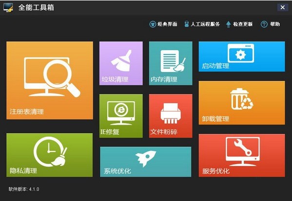 下载《全能工具箱 v4.1.0》是一款系统清理维护的软件,这款软件集合用户隐私清理,系统垃圾清理,系统性能优化及ie修复等功能,软件内的功能非常丰富,操作也很简单,是一款非常不错的软件,有需要的小伙伴快来下载叭!