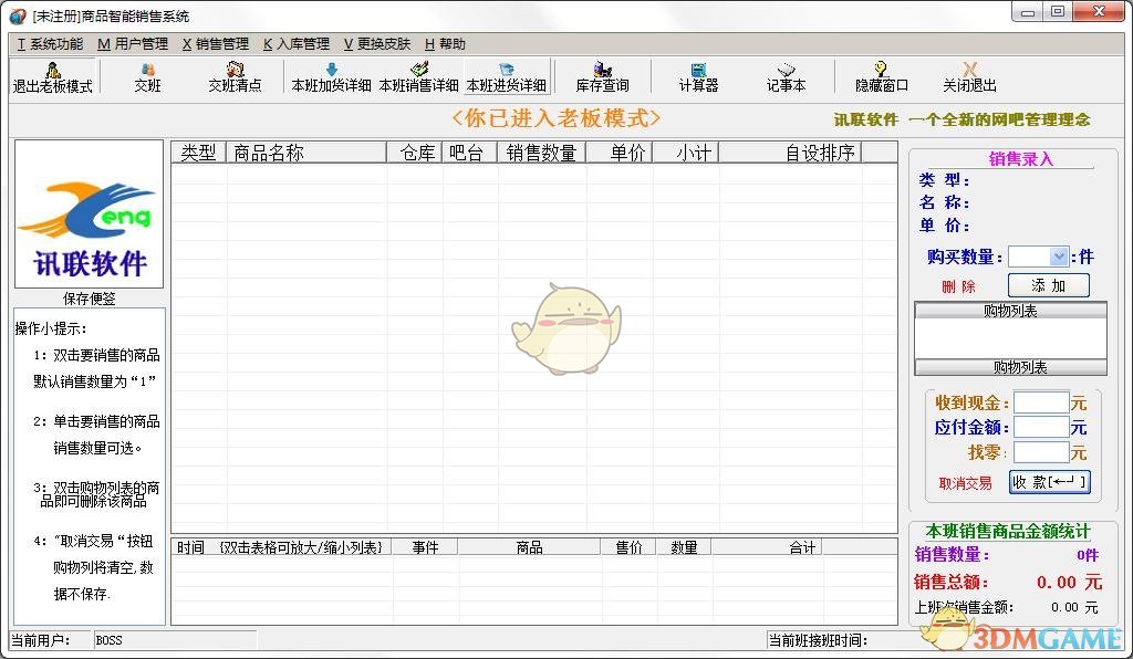 界面美观华丽,功能强大,上手简单。计算机化管理,使网吧商品变动不再是糊涂帐。强大的报表功能,让您随时了解商品销售经营情况。让你管理更省心。员工交班更快捷准确,为您节省交班的时间。