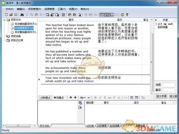 5.支持原文译文左右对照及上下排列的两种输入模式,用户可以根据个人习惯采用,两种输入模式可以随时切换。单句模式会自动对词进行翻译,点击即可输入,加快录入速度。