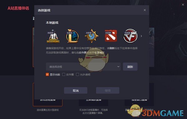 点击游戏选择按钮,弹出游戏选择框,A站直播伴侣会自动识别你已经安装并打开过的游戏。双击可以启动未打开的游戏或者将已经打开的游戏添加至直播窗口,此时将游戏放到全屏,直播伴侣便可直接读取游戏页面到已添加的窗口。