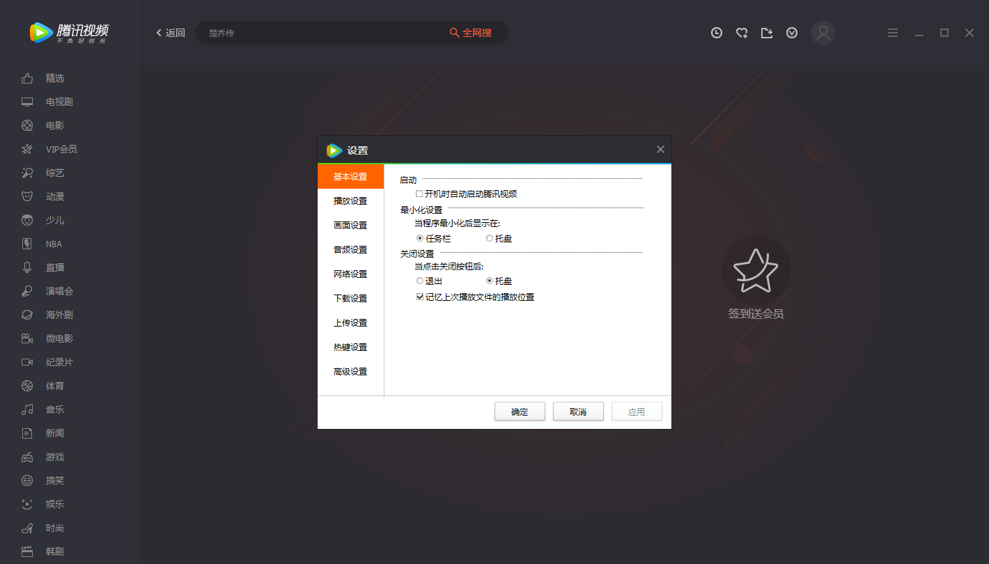 2)点开设置后选择基本设置,将记忆上次关闭播放时文件的播放位置进行勾选即可。