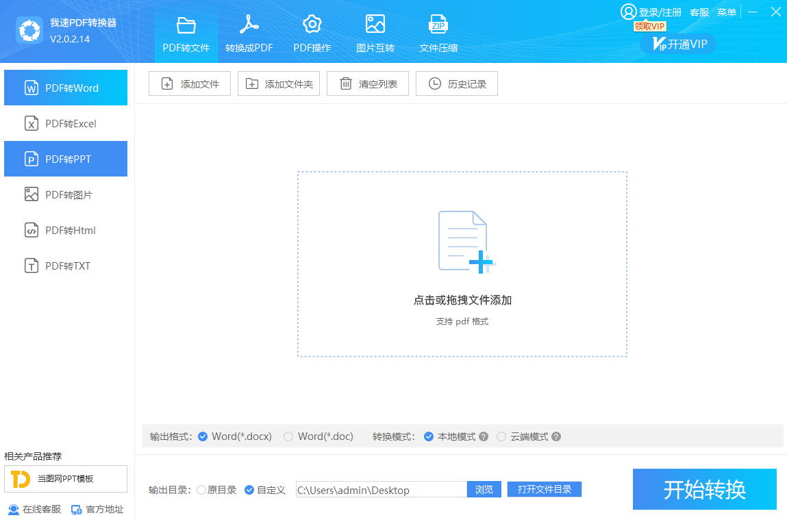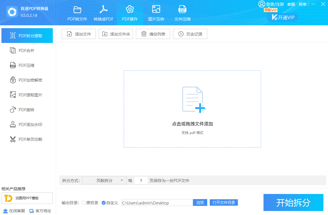 支持PDF、Word、PPT、Excel、图片、TXT、html文件的批量互转,新增PDF合并、压缩、拆分、页面提取功能