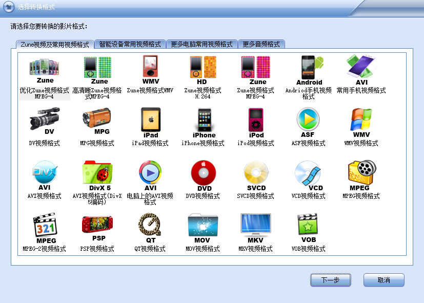 支持Zune官方所支持标准视频格式WMV、MP4、H.264视频格式转换。