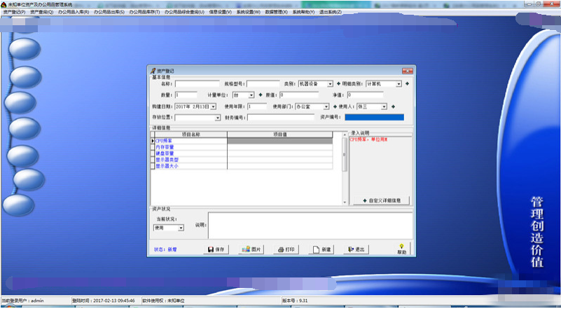 4、系统设置:可以修改口令、操作设置、资产禁止二次修改项目;
