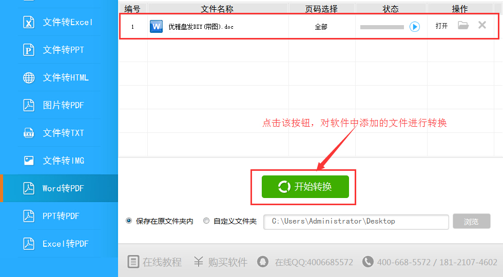 双击桌面快捷方式打开Word转换成pdf转换器,软件中间会有操作提示,按照提示选择对应的文件类型,选择好保存位置后,单击【开始转换】即可