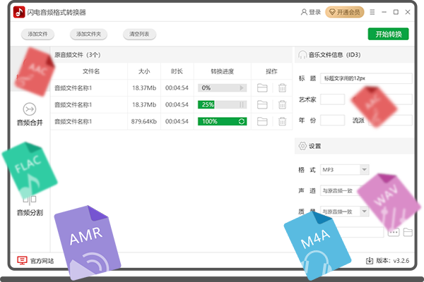 可拖拽或者点击添加单个音频文件,也能添加多个文件进行批量音频转换,添加完成后,选择需要转换的音频格式,快速转换完成。支持多种音频格式的转换,如:wav转mp3、ogg转mp3、flac转mp3、amr转mp3、m4a转mp3等。