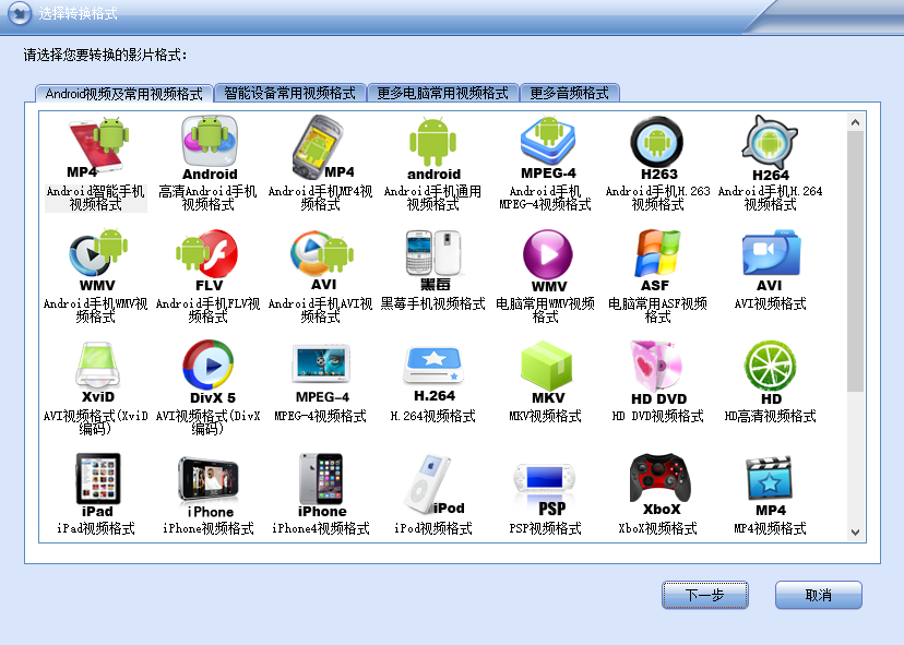 支持Android手机官方所支持标准视频格式3GP、3G2、MP4、MPEG-4、MP4-AVC (H.264)、H.263视频格式转换。