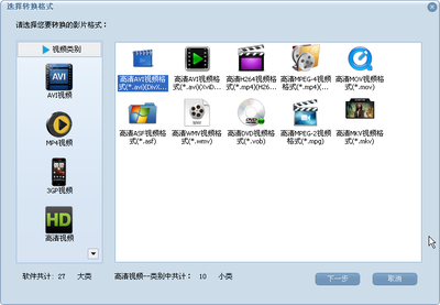 软件中预先设置了上百种视频音频格式转换方案。对于我们常见的各种视频格式AVI、MP4、MPG、WMV、ASF、3GP、MKV、VOB、FLV、SWF、MOV、QT、F4V、M4V、RM都能随意转换。软件同样可以转换各种高清摄像机录制的视频如MTS、M2TS、H.264/AVC AVCHD、MPEG-2为各种我们常用格式的视频格式。
