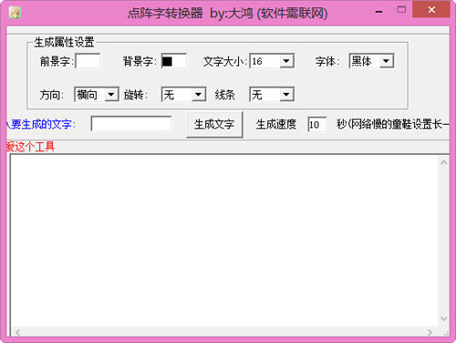 下载大鸿点阵字转换器是一款专业的普通文字转换点阵艺术字的工具软件,支持字体大小、颜色设置,背景颜色设置等等。十分方便快捷,界面简约,布局直观清晰,极易上手,是一款不可多得的利器。