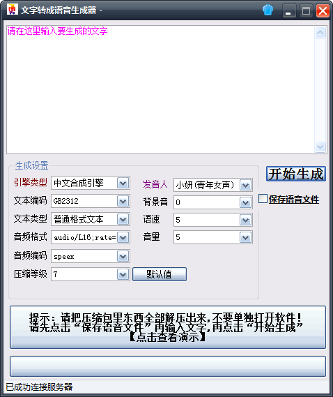 使用语音自动生成器转换语音之前可自定义引擎类型、文本编码、文本类型、音频格式、音频编码、压缩等级、发音人、背景音、语速、音量等选项。通过该软件制作免费的语音可以用作mc喊麦说话开场,也可以录制文字表白情书。生成的语音文件在软件运行目录!