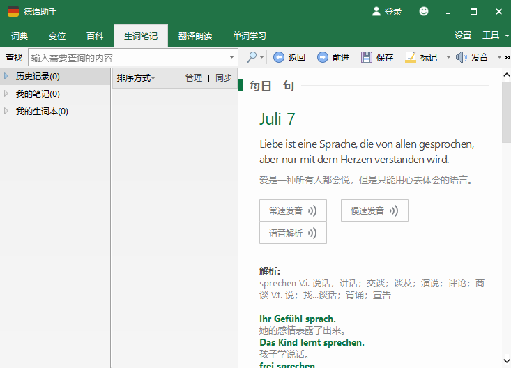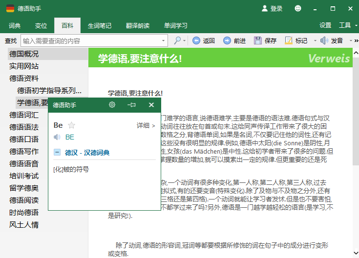 《德语助手》内置了德语18种时态的动词变位方法,支持一万余个常用动词的查询和反查,大大方便了德语初学者。同时整理不同时态的变位规则,帮助使用者尽快掌握德语动词变位。