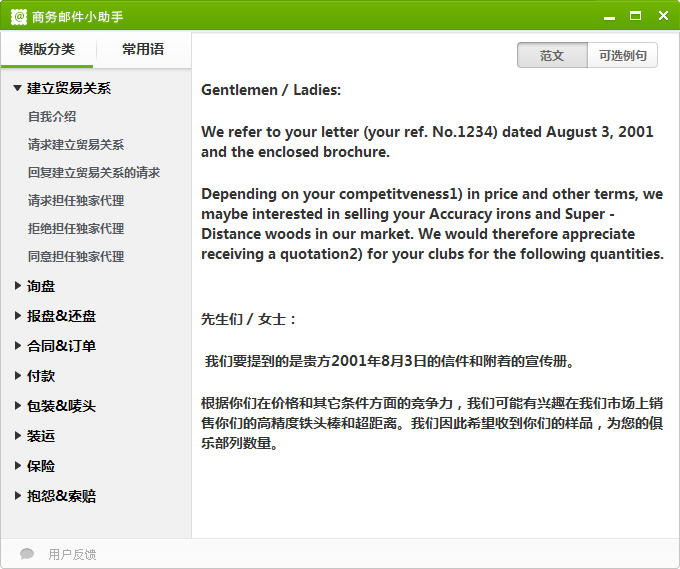 中英对照:例句范文100%中英文对照,让您在轻松写邮件的同时不费吹灰之力看懂来函。
