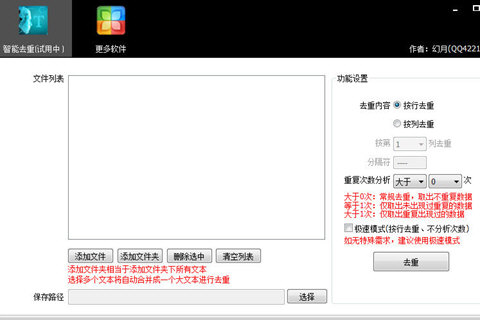 幻月智能去重是一款专业的文本去重的工具软件,依靠软件算法可以帮助使用者识别文本当中重复的数据、内容进而删除,十分方便快捷,界面简约,布局直观清晰,操作简单,极易上手,是一款不可多得的利器。