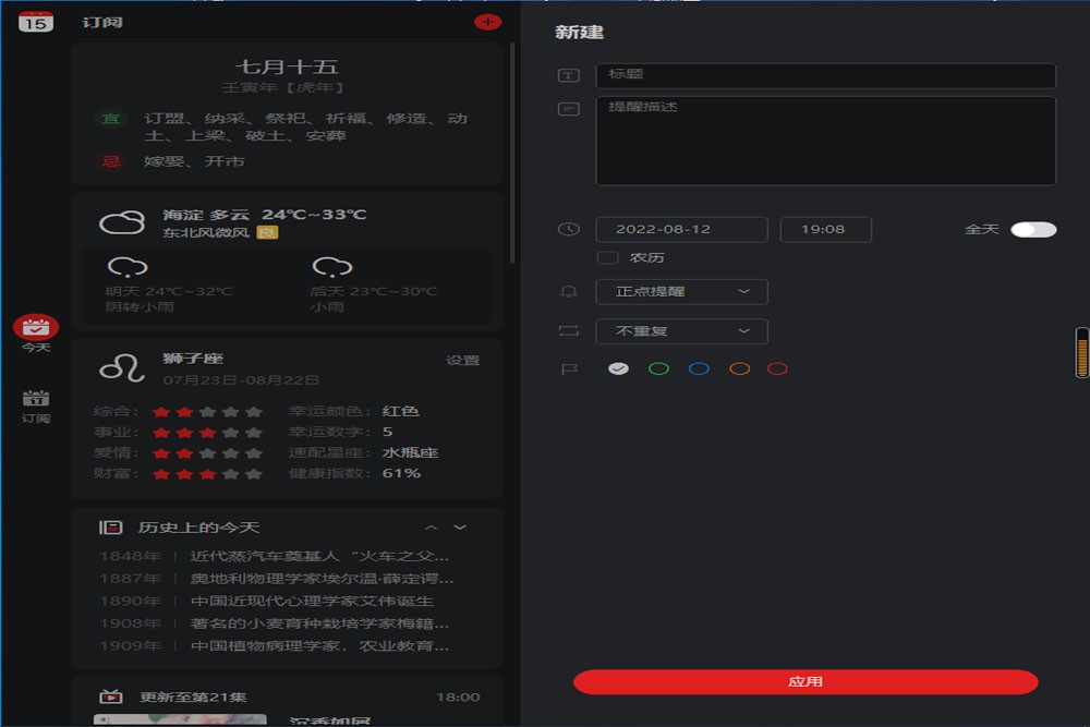 360日历是一款专业的桌面日历的工具软件,360日历支持显示公历、农历、时间、法定节假日、24节气、以及本地天气预报,并且会推送每日十分方便快捷,界面简约,布局直观清晰,操作简单,极易上手,是一款不可多得的利器。