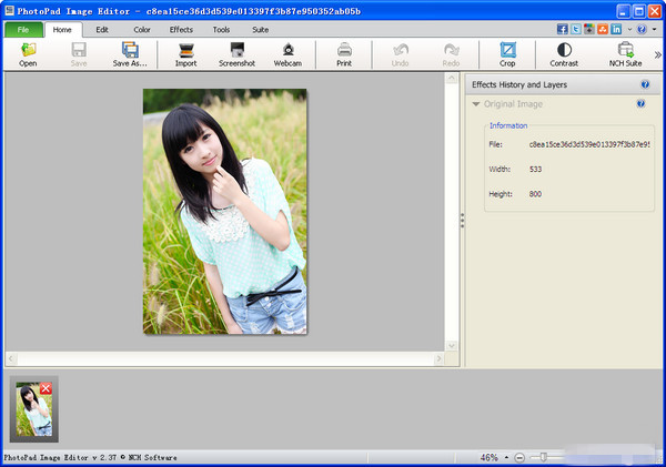 历史记录使用了类似photoshop中的图层功能。特效的先后顺序能够任意调整,也可以点击每个记录左侧的“眼睛”图标,从而暂时忽略这种效果,点击右侧的“X”号则能够删除这种效果,简直人性化到了极点。