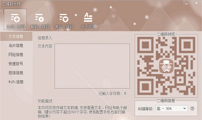 二维码大师是一款专业的二维码生成的工具软件。支持文本、手机号、邮箱地址、无线网密码等等资料生成二维码。十分方便快捷,界面简约,布局直观清晰,操作简单,极易上手,是一款不可多得的利器。