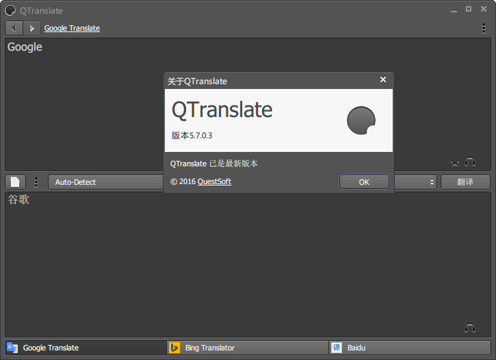 QTranslate是一款专业的翻译引擎集合的工具软件。你只需要输入所需翻译的文字。选择翻译后的语言,就可以直接查询到5个翻译引擎各别翻译的词句,十分方便快捷,界面简约,布局直观清晰,操作简单,极易上手,是一款不可多得的利器。
