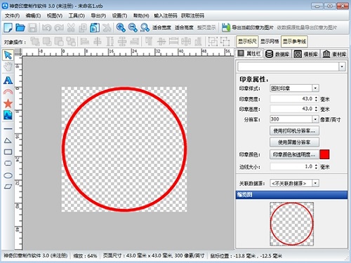 软件界面主要由标题栏、操作按钮区域、工具栏、印章编辑区域、属性栏、模板库、素材库、缩览图等区域构成。其中最常用的是工具栏、属性栏和印章编辑区域。