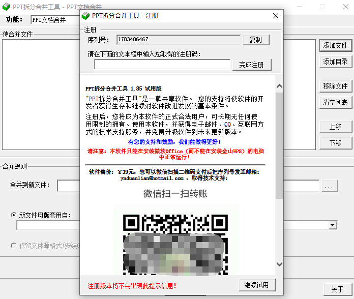 PPT拆分合并工具是一款专业的ppt文件的拆分和合并的工具软件,软件可以将多个ppt文件合并一个,也可以将一个PPT文件拆分多个,十分方便快捷,界面简约,布局直观清晰,操作简单,极易上手,是一款不可多得的利器。