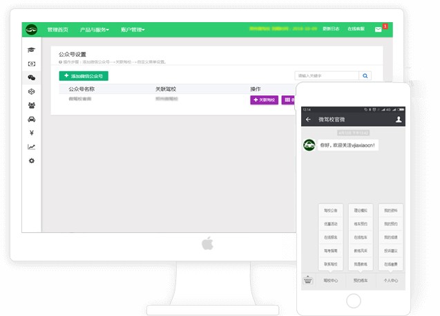 帮助驾校快速智能的完成驾校微信公众号功能的部署,功能专为驾校行业定制,让传统驾校服务完美对接微信公众号,学员关注驾校微信公众号,绑定后即可实现在线模拟考试、预约练车、查询预约、查询考试成绩等。同时还有在线报名、驾校公告、优惠活动、驾校地图、投诉建议等等功能,以上这些无需专业人员,只需5分钟即可轻松实现。