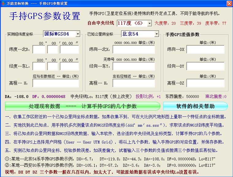 能满足测量人员、地质人员、科考人员、工程技术人员等,对地图知识及坐标知识的学习与工作应用;可在多套坐标系间进行经纬度与公里网坐标的转换;可在北京54、西安80、国家2000、地方坐标系间进行公里网坐标转换;可对跨两个分带的坐标点进行跨带坐标转换;可对六度带、三度带、一点五度带的坐标点进行相互转换;并能进行手持GPS参数设置。采用模糊技术提取、处理各项数据,输出直观的转换成果;并能方便存储、提取坐标数据。能满足国内外坐标转换的工作需求。